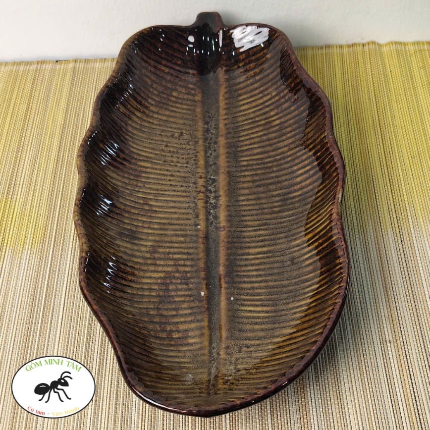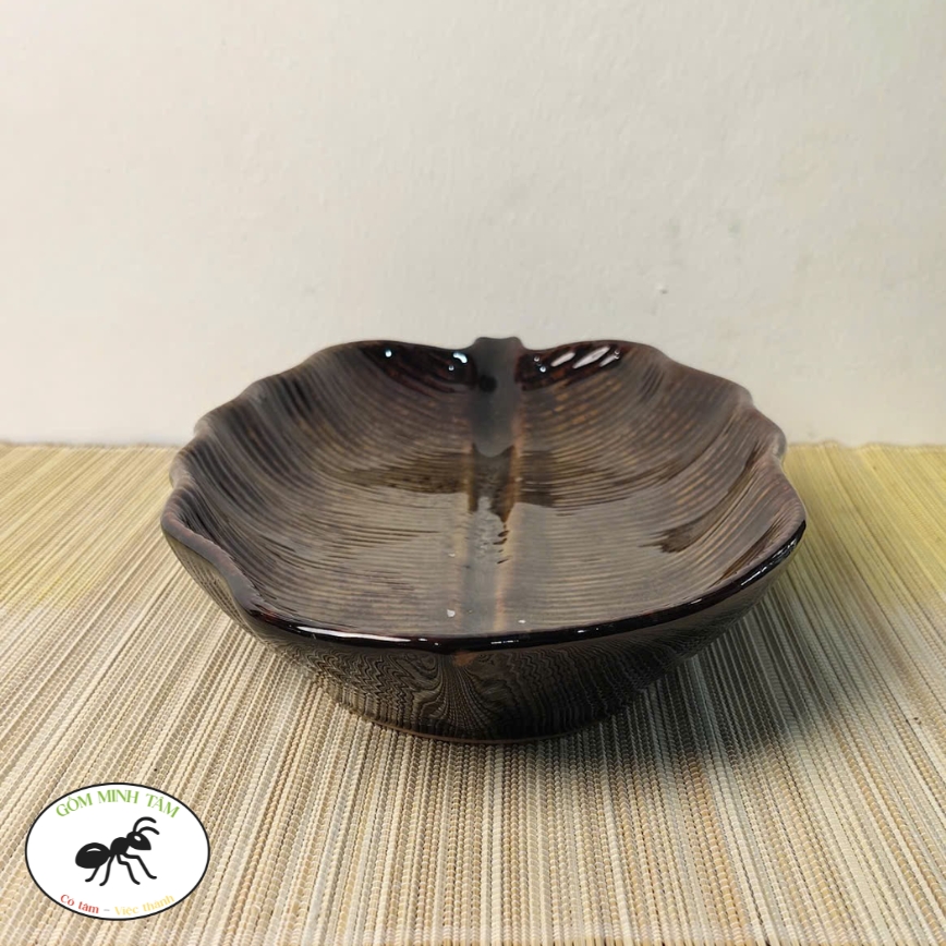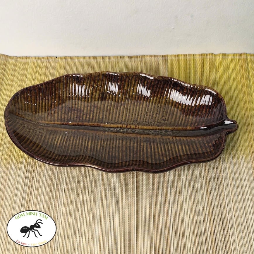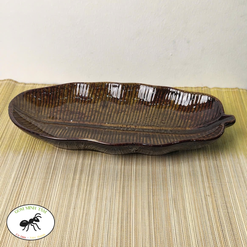 Đĩa lá chuối sâu lòng 30cm nâu đậm – Gốm Minh Tâm Phù Lãng Bắc Ninh – nghiêng dọc